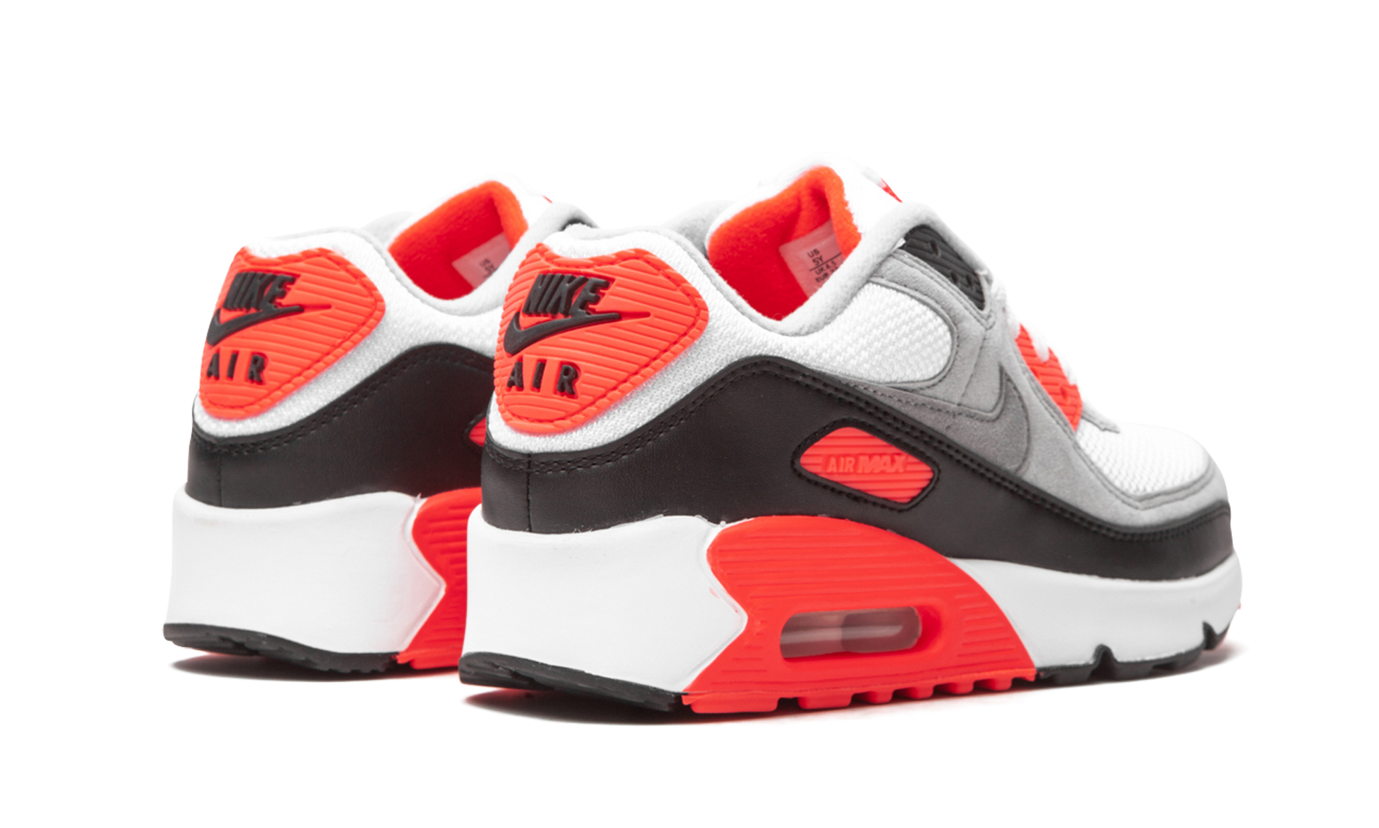 The Nike Air Max 90 GS “Infrared 2020” is the youth sizing of the all-time classic colorway of the retro runner. Nike celebrated the Air Max 90's 30th anniversary in 2020 by releasing this legendary "Infrared" colorway of the model. This Fall 2020 version of the low-top performance shoe features the original shape and materials used on the first batch of colorways from 1990. The upper displays a mixture of materials and colors arranged in true-to-original fashion. White mesh is located on the toe and collar. The mid-panel, toe, and collar display a contrasting grey felt overlay that breaks up the appearance. Other details include a slightly darker shade of grey on the Swoosh on the mid-panel and “Infrared” accenting on the eyelets, Air Max branding window, heel tab, and panel that surrounds the clear Air unit in the heel. A black leather mudguard finishes off the look. Release date: November 9, 2020. Infrared 2020