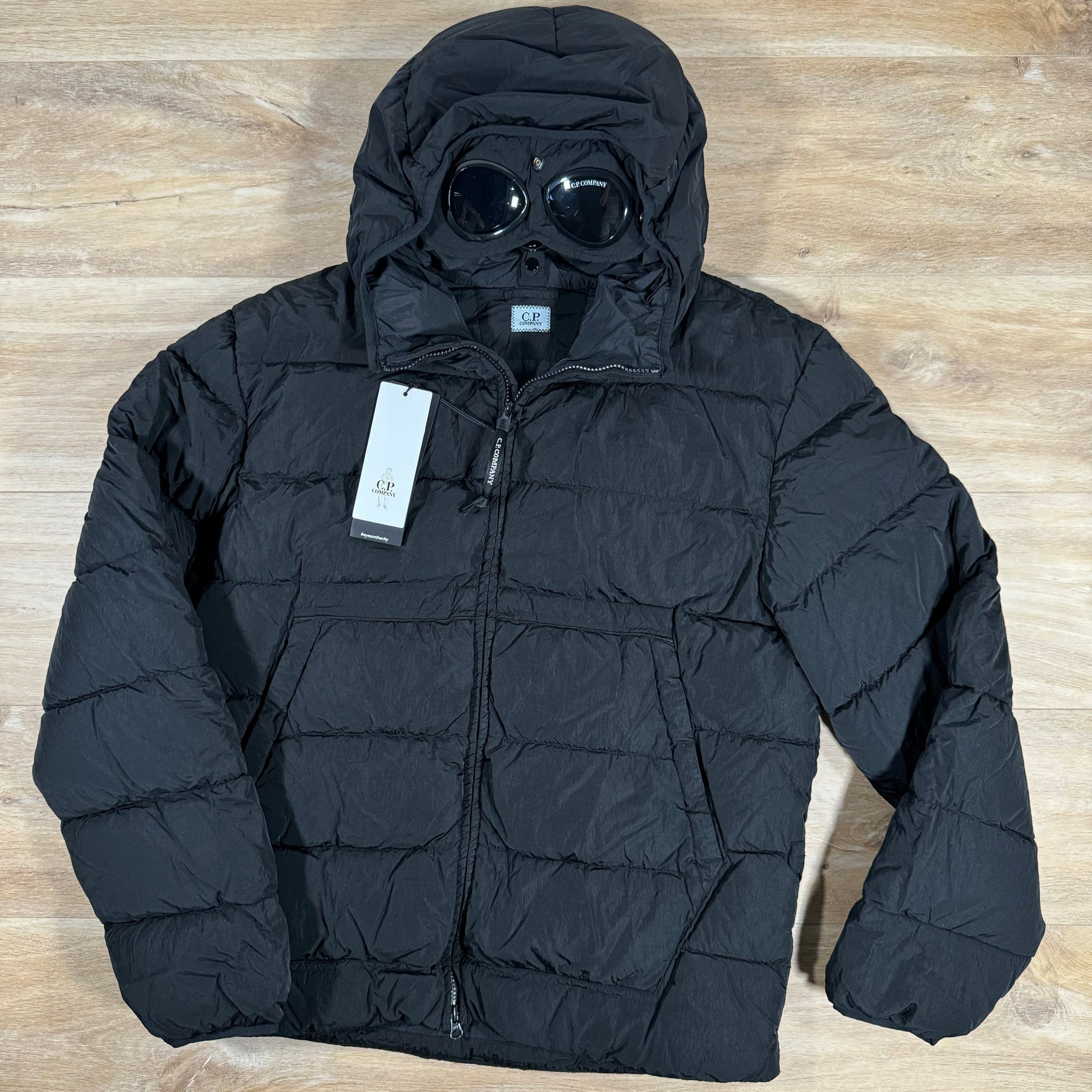 The CP Company goggle down jacket is made from Chrome-R, a 100% recycled, shiny multifilament nylon created from production waste. It features a garment-dyed anti-drop treatment for water resistance. The jacket includes an adjustable Goggle hood, a two-way zip fastening, and side zip pockets for functionality. Ribbed cuffs provide a snug fit, and the jacket is designed with a regular fit for comfort and versatility.