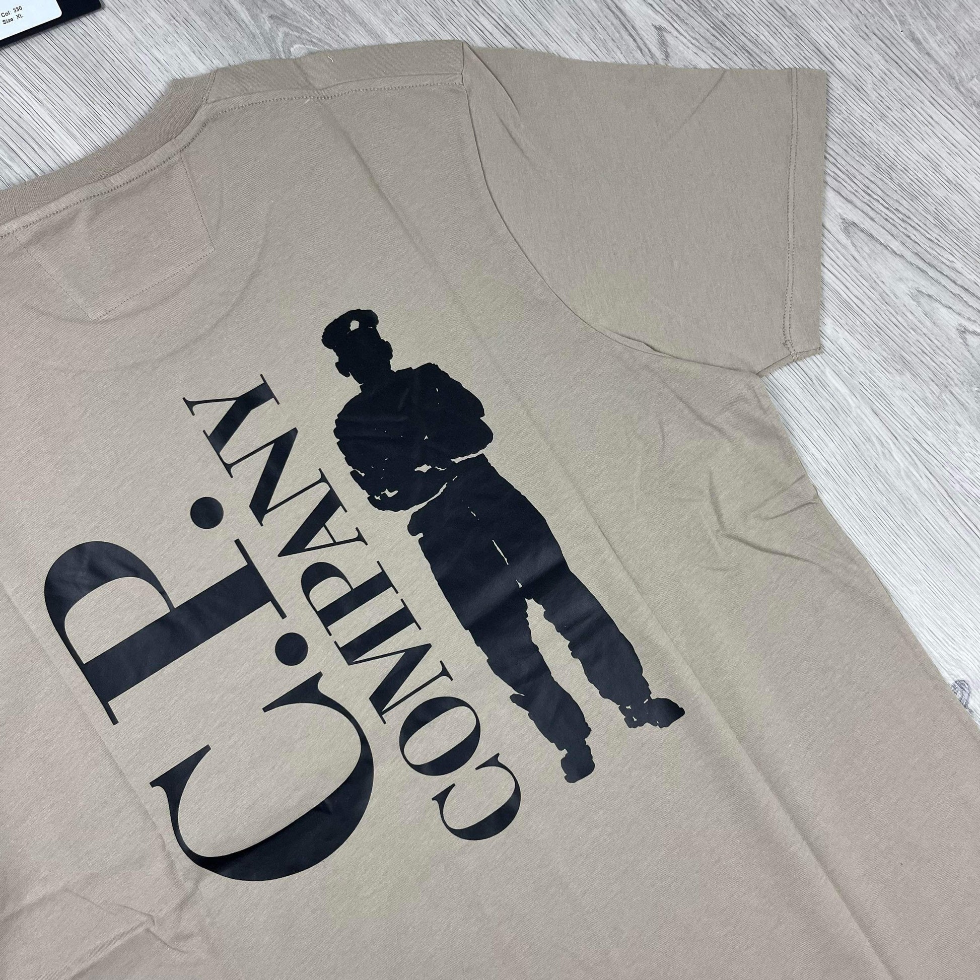 Cobblestone Beige CP Company 30/1 jersey T-shirt with small white logo print and large British sailor print on the back