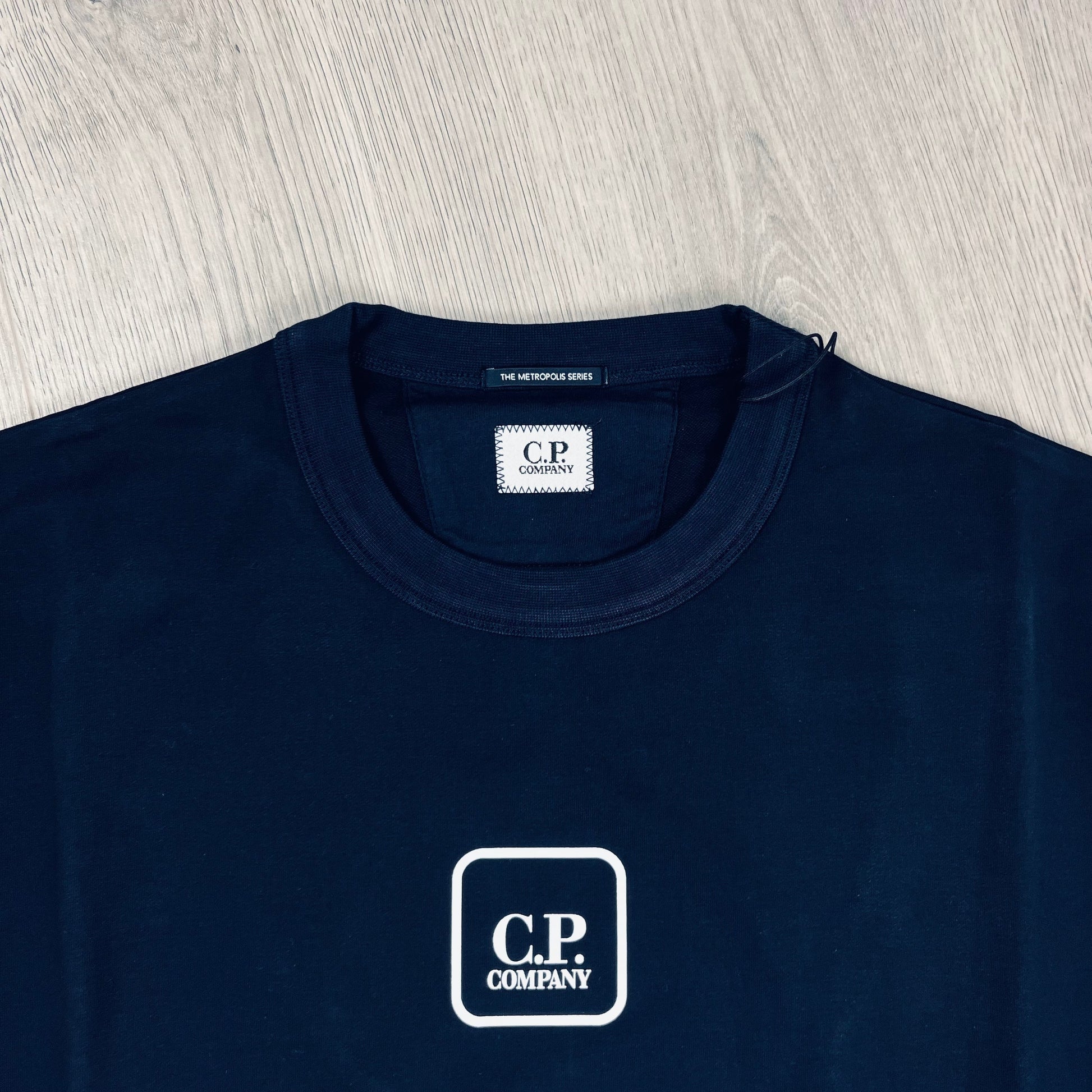 Total Eclipse Navy Blue CP Company Metropolis crew neck sweatshirt with centrally printed white box logo and graphic logo print on the reverse