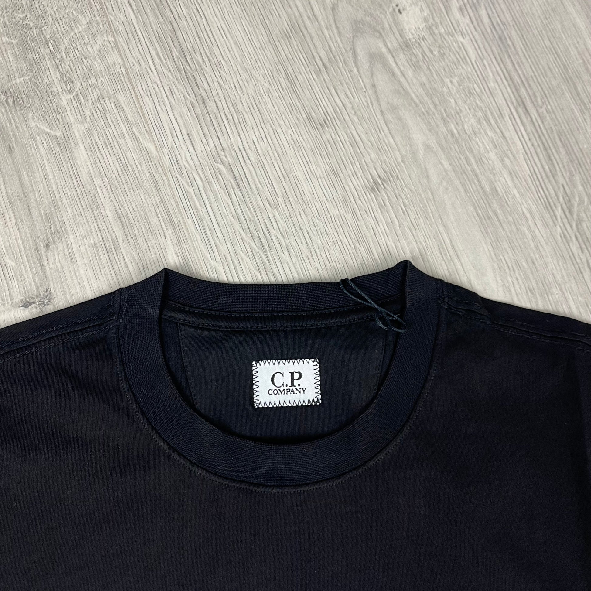 Black CP Company long-sleeve T-shirt with centrally printed box stamp logo in black.