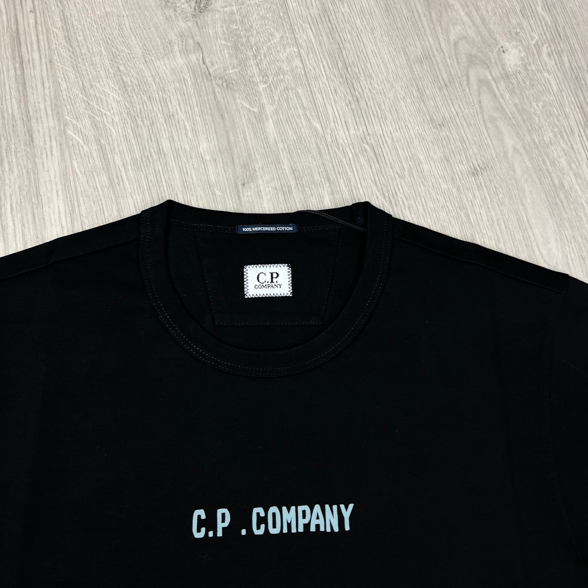 Black CP Company 30/2 jersey cotton T-shirt with centrally printed typographic logo