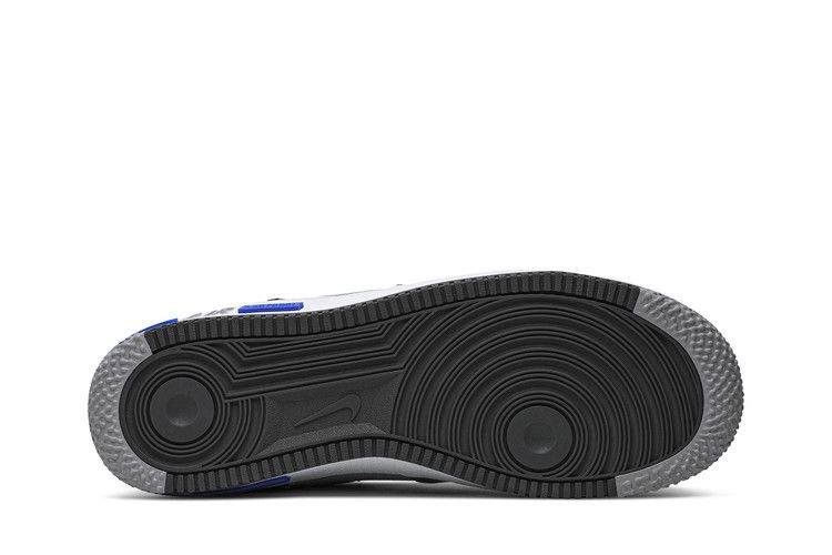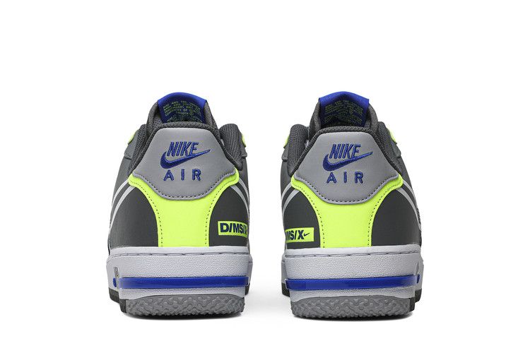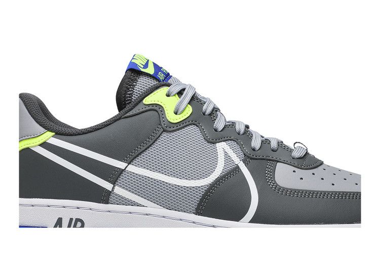 The Nike Air Force 1 React Wolf Gray features a leather and mesh upper in Wolf Gray, Smoke Gray, and dark gray, accented with white, blue, and neon green. Perforations on the gray toebox enhance breathability. Oversized white Swooshes and neon green backstay stitching add bold contrast. React cushioning with a heel Air bag provides responsive support in the drop-in foam insole. D/MS/X branding appears on the medial heel, while Nike Air logos adorn the heel counter, midsole, and tongue. Released on January 17, 2020, the Nike Air Force 1 React Wolf Gray is available now at Side Kicks.