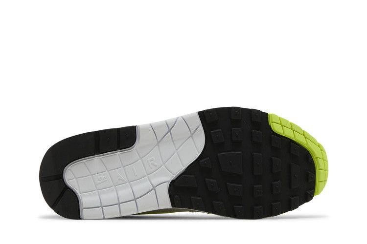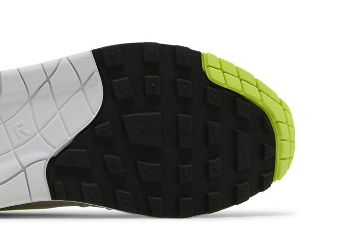The Nike Air Max 1 '87 Volt Suede (Women's) features a suede and mesh upper for lightweight comfort and durability. It includes an Air window on the black rubber outsole and a mudguard for outdoor running. The design showcases neon yellow accents, eyelets, and Swoosh branding on the side. Released on August 31, 2023, the Nike Air Max 1 '87 Volt Suede (Women's) is available now at Side Kicks.