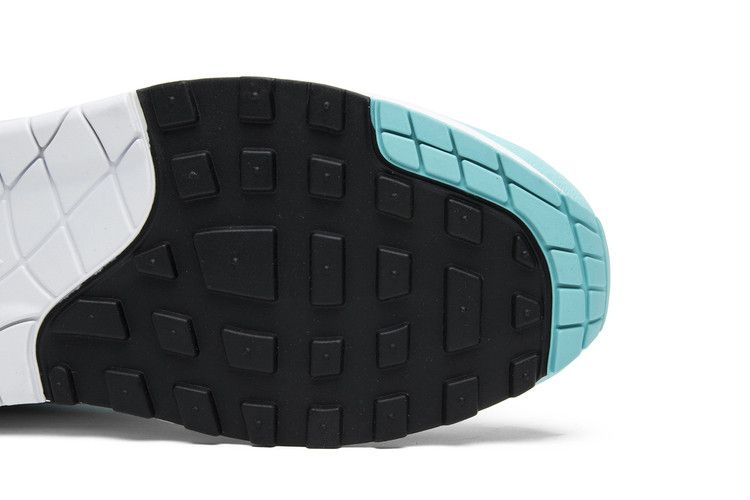 The Nike Air Max 1 Anniversary Aqua features a white upper with grey side panels and aqua accents on the mudguard, Swoosh, and toe. Purple detailing appears on the heel's Nike Air branding and tongue. Constructed from suede and leather, it includes a rubber sole with visible Air cushioning. Released on March 2, 2018, the Nike Air Max 1 Anniversary Aqua is available now at Side Kicks.