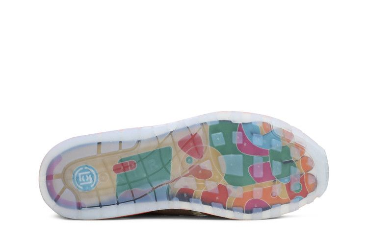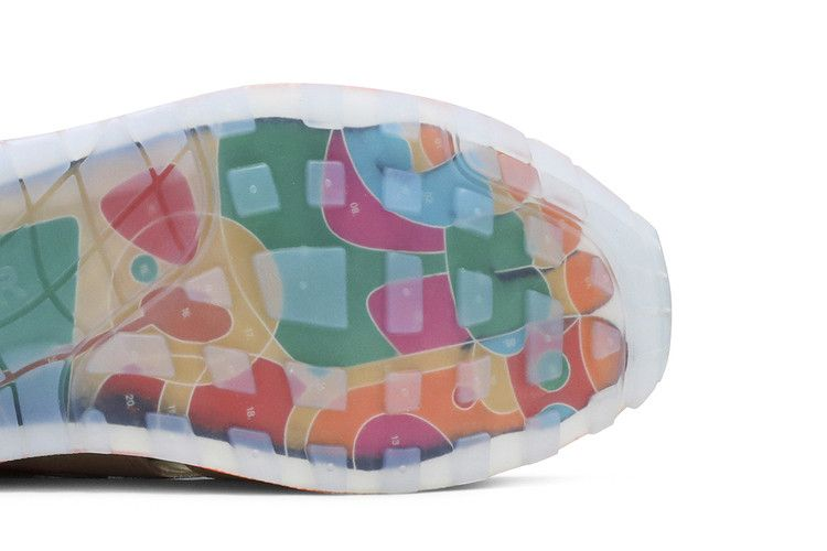 The 2021 reissue of the CLOT x Nike Air Max 1 ‘Kiss of Death’ features a deconstructed tan suede upper with transparent paneling on the toe box and a scaly texture on the Swoosh. The heel overlay showcases an orange CLOT logo against a red backdrop, while the translucent rubber outsole reveals a reflexology-inspired graphic in a multicolor design. This collaboration between Nike and CLOT pays homage to Chinese traditions and medicine, blending innovative design with cultural storytelling.