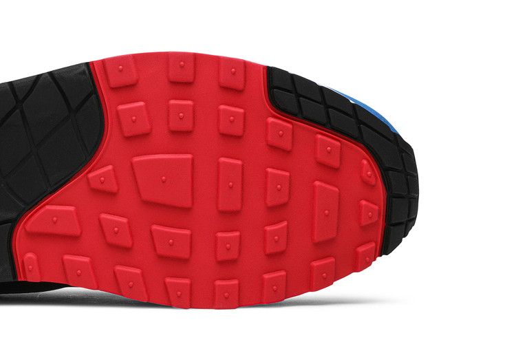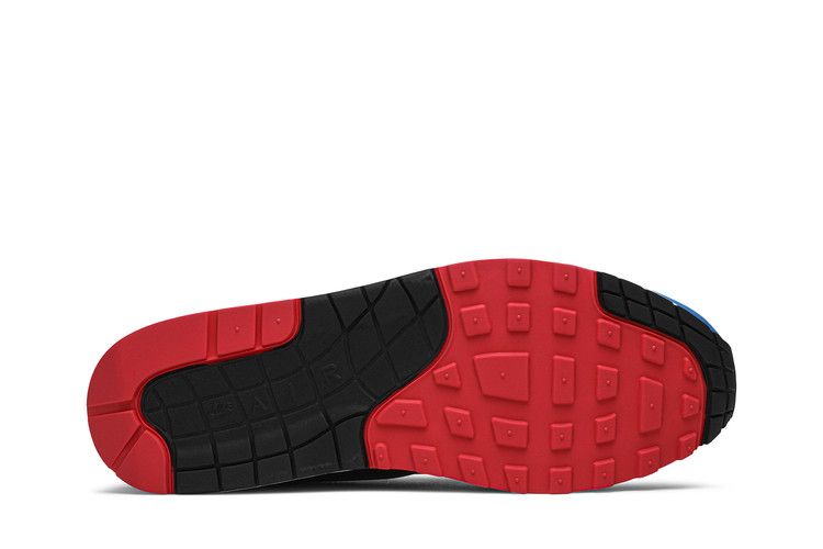 The Nike Air Max 1 Time Capsule Pack has a black, Cement Grey, and Imperial Blue leather upper with doubled Swoosh overlays. Red accents on the mudguards and outsole finish the design. Released on November 2019, the Nike Air Max 1 Time Capsule Pack is available now at Side Kicks.