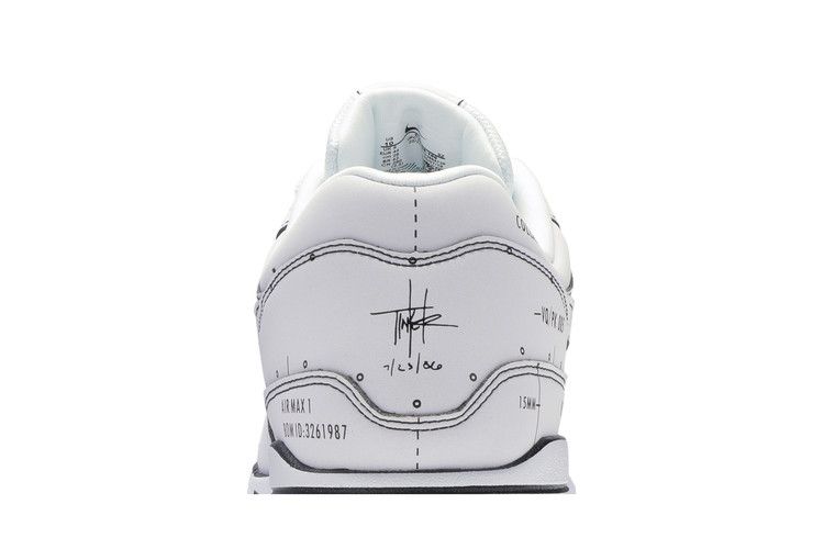 The Nike Air Max 1 Tinker Schematic features a white leather upper with black design notes and detailed schematic lines from the original blueprint. Key details include Tinker Hatfield’s signature on the right heel, Nike Air branding on the left heel, tongue, and insole, and "Schematic, Property Of Nike, Not For Resale" stamped on the sock liner. The white midsole with black accents houses a visible Max Air unit, paired with a vast gray rubber outsole. Released on August 9, 2019, the Nike Air Max 1 Tinker Schematic is available now at Side Kicks.
