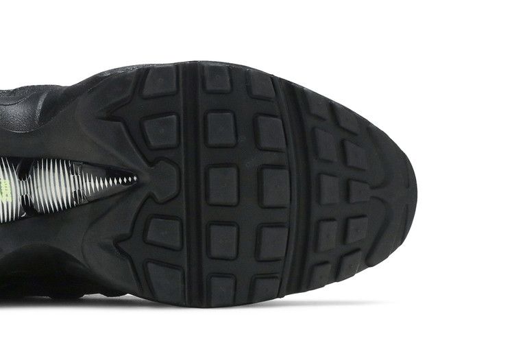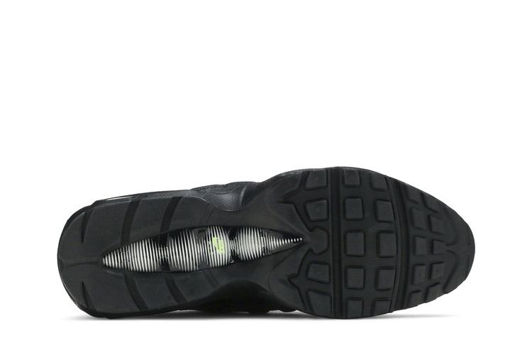 The Nike Air Max 95 Antifreeze 2019 features a black upper with Summit White and Voltage Green accents on the Swoosh, tongue, and heel branding. The design includes a parted-patterned outsole for traction and Black laces for a secure fit. Visible Air Max units in the sole provide impact absorption and cushioning. Released on September 23, 2019, the Nike Air Max 95 Antifreeze 2019 is available now at Side Kicks.