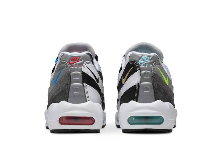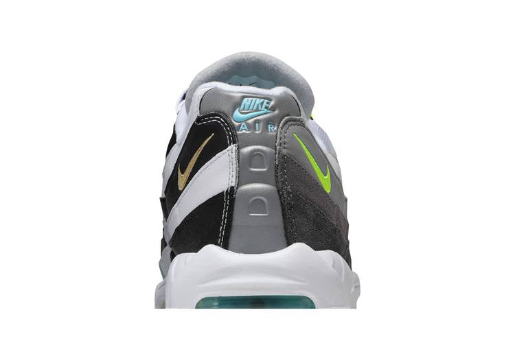 The Nike Air Max 95 Greedy (2020) is a celebratory release marking the silhouette's 25th anniversary. The sneaker features a unique mashup design with OG-inspired color blocking on the lateral sides and misaligned overlays on the medial sides. The asymmetrical coloring extends to the tongue, mesh lace guards, and heel loops, creating a distinctive look. The Max Air units in the white foam midsole also showcase the mismatched theme. Made from a combination of leather, suede, and rubber, this shoe is a standout addition to any sneaker collection.