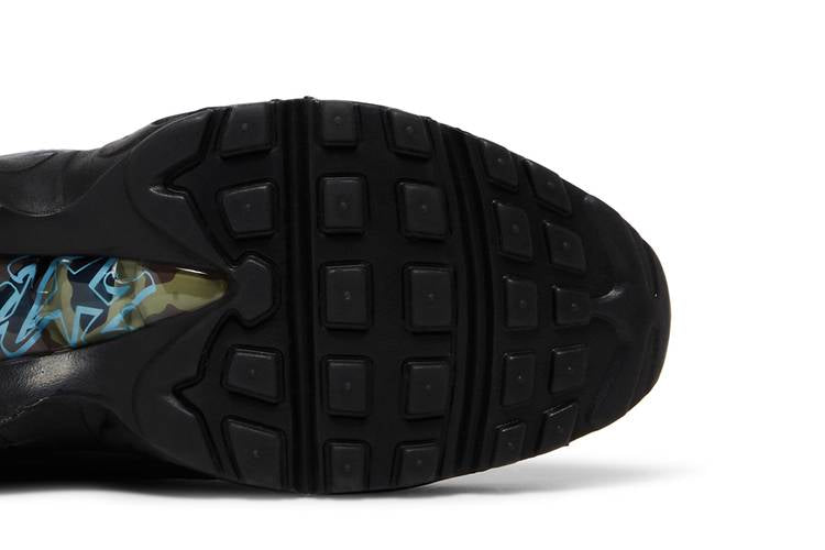 The Nike Air Max 95 SP Corteiz Aegean Storm is a collaborative sneaker from Nike Sportswear and UK brand Corteiz. Part of the 'Rules the World' pack, this special edition features a leather and mesh upper with wavy overlays in a dark grey finish. The shoe includes black netting, camo print lining, and drawcord lacing. Corteiz branding is embroidered on the shoe, with a blue Swoosh on the heel. The sneaker sits on a black midsole with Max Air units in the forefoot and heel. Stylish and unique, the Nike Air Max 95 SP Corteiz Aegean Storm is a standout addition to any collection.