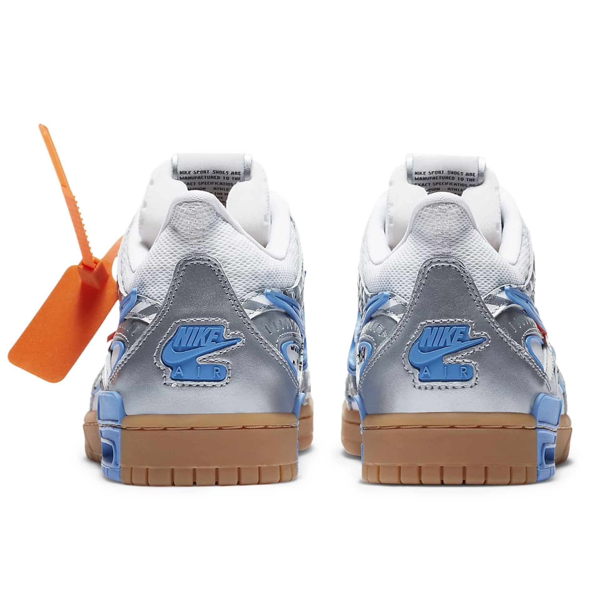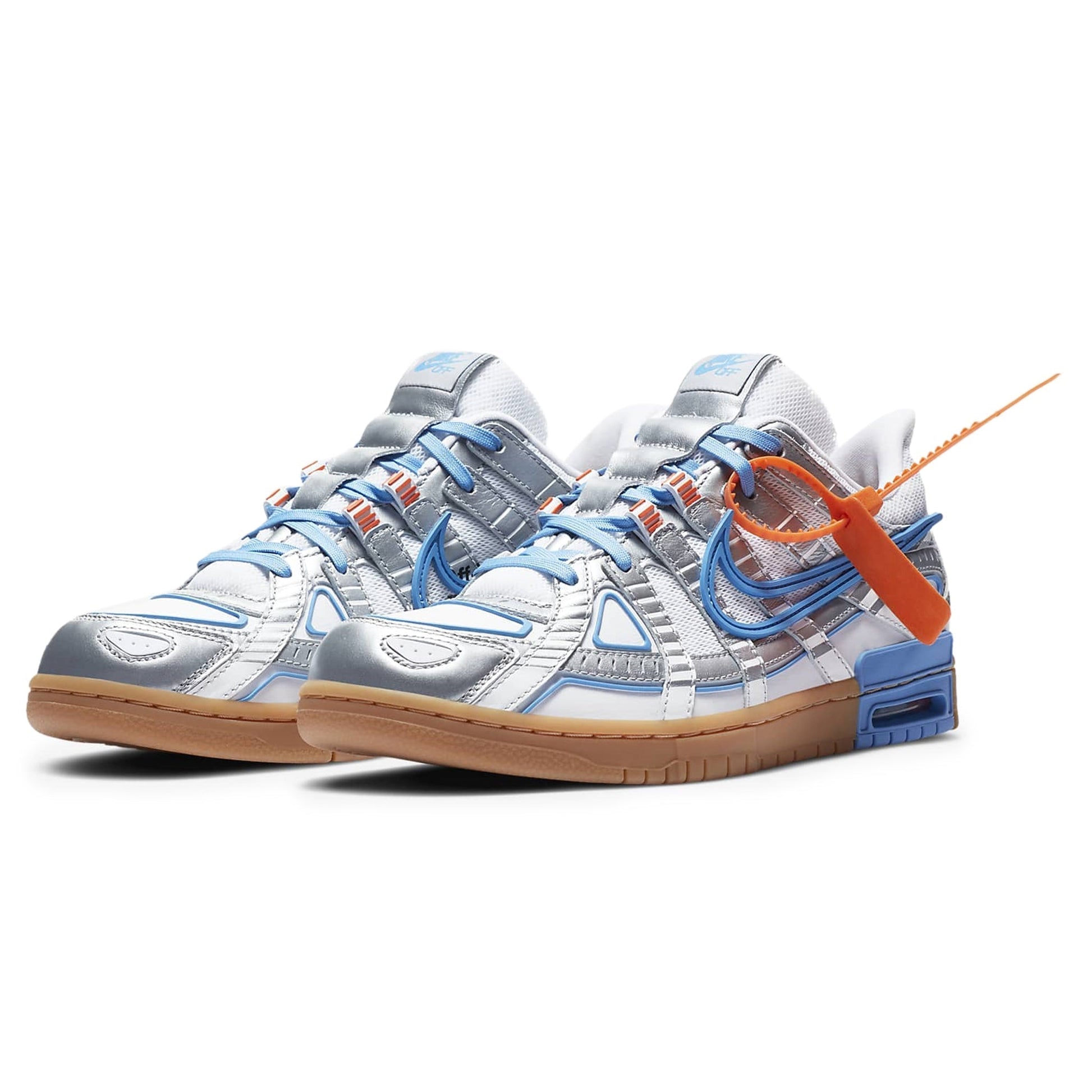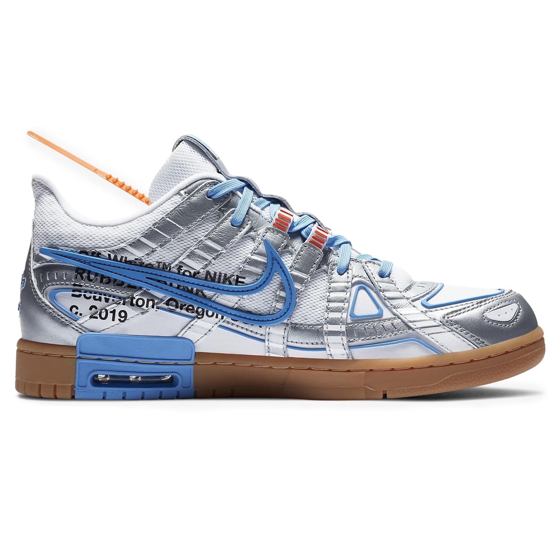 The Nike Air Rubber Dunk Off-White University Blue (PS) is a limited edition sneaker designed for little kids. Inspired by Nike's Pegasus line from the late '90s and early 2000s, this shoe features a white mesh upper with metallic silver overlays and University Blue accents. The design includes a gum rubber cupsole for traction. The shoe is encased in a silver metallic leather cage with deconstructed rubber elements and Off-White branding. The gum sole unit showcases an Air window in University Blue, while orange accents and Off-White tags add pops of color. The shoe also includes a set of "University Blue" laces and black Swoosh on yellow insoles. Released on 1st October 2020.