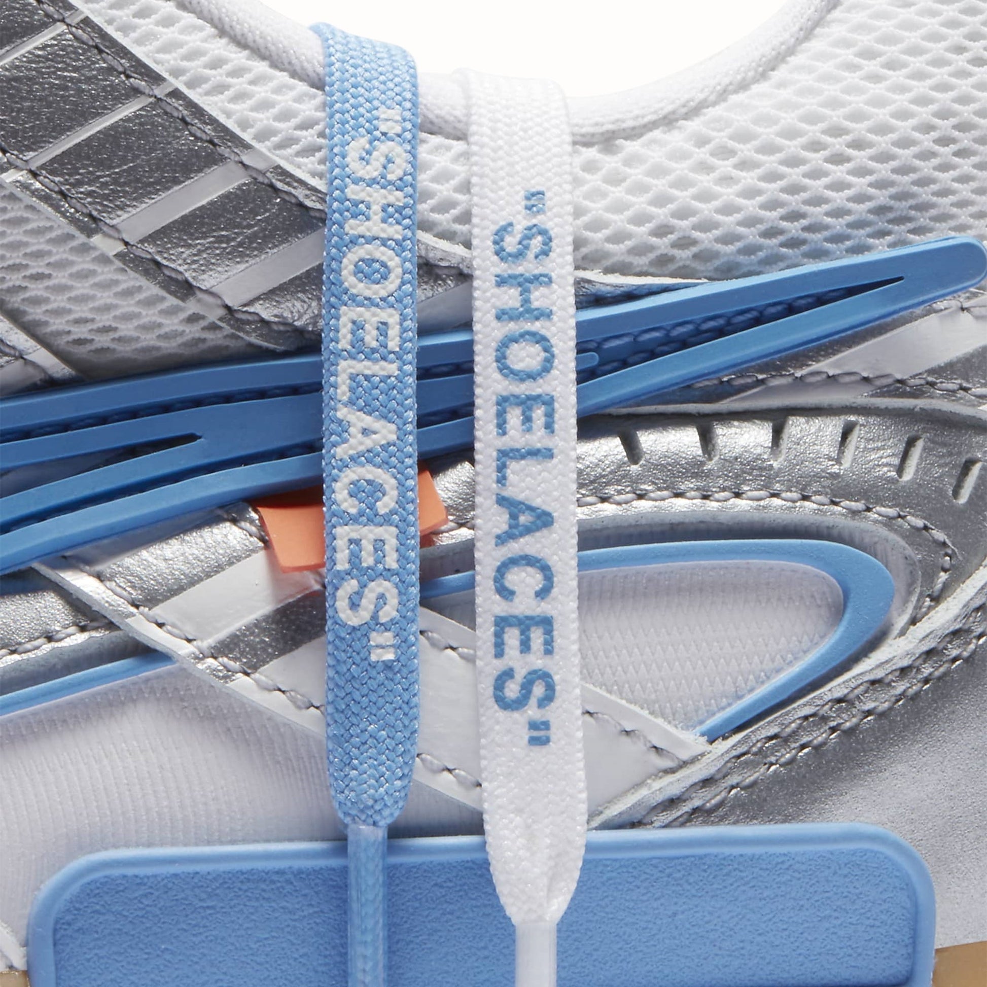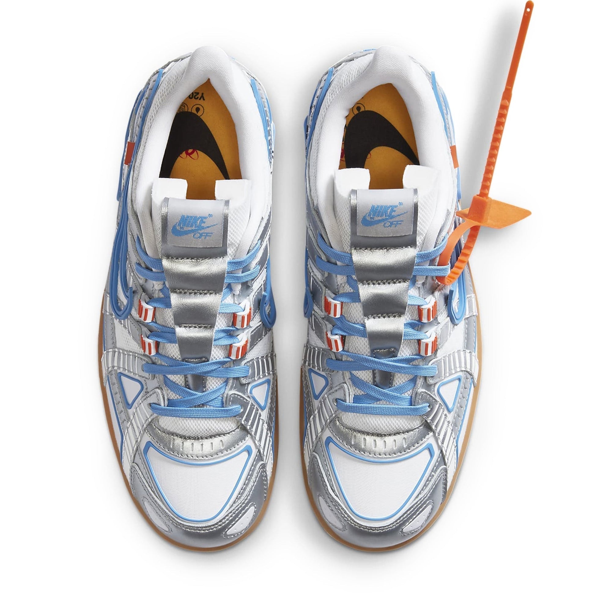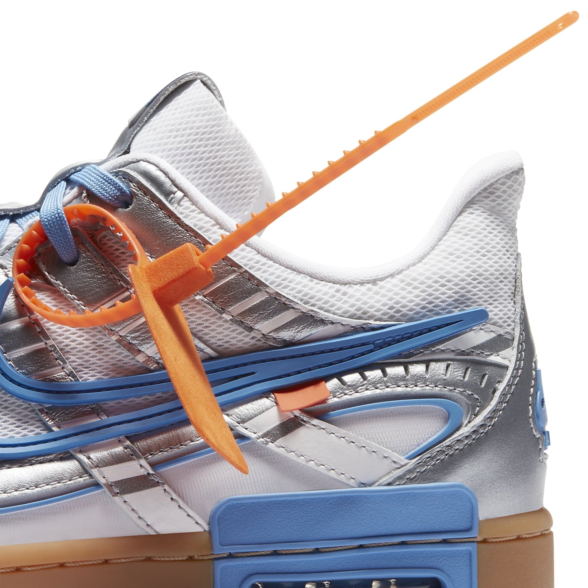 The Nike Air Rubber Dunk Off-White University Blue (PS) is a limited edition sneaker designed for little kids. Inspired by Nike's Pegasus line from the late '90s and early 2000s, this shoe features a white mesh upper with metallic silver overlays and University Blue accents. The design includes a gum rubber cupsole for traction. The shoe is encased in a silver metallic leather cage with deconstructed rubber elements and Off-White branding. The gum sole unit showcases an Air window in University Blue, while orange accents and Off-White tags add pops of color. The shoe also includes a set of "University Blue" laces and black Swoosh on yellow insoles. Released on 1st October 2020.