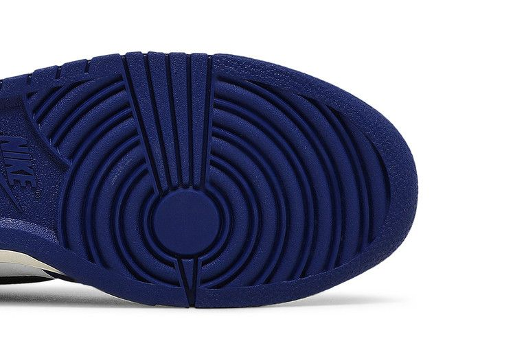 The Nike Dunk High AMBUSH Deep Royal is a collaboration between Nike and Tokyo-based brand AMBUSH, featuring a vintage silhouette with a stylized twist. The shoe boasts an all-leather upper with white base, royal blue overlays, and an oversized black Swoosh inspired by motorcycle tailpipes. AMBUSH branding is prominently displayed on the external TPU heel counter and exposed foam tongue. The high-top design sits atop a standard rubber cupsole with white sidewalls and a royal blue outsole.