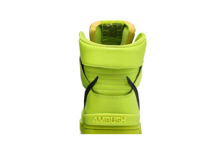 The AMBUSH x Nike Dunk High ‘Flash Lime’ features a fluorescent green colorway inspired by Tokyo's bright lights. The sneaker includes a black TPU Swoosh, co-branded tongue tag, exposed foam tongue, reconstructed collar, and external heel clip with embossed Ambush branding. The rubber cupsole matches the green finish.