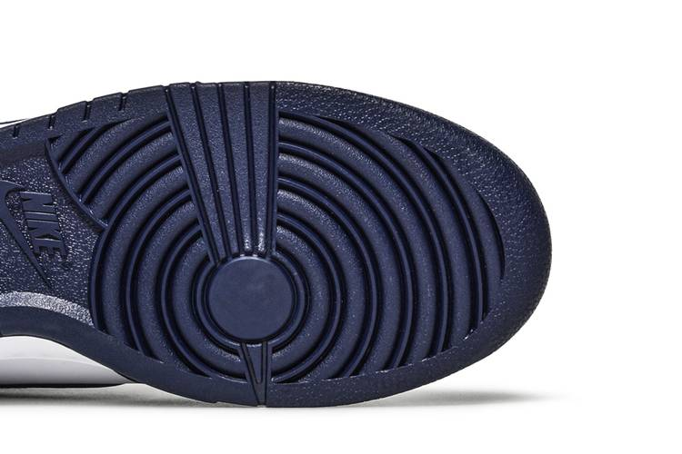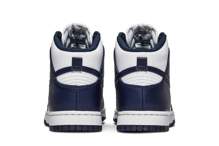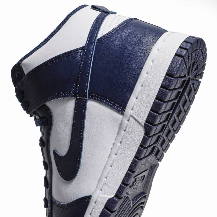 The Nike Dunk High Championship Navy, also known as the Nike Dunk High Villanova, features a white leather upper with Championship Navy overlays. Originally released in 1985 as part of the ‘Be True to Your School’ series for Villanova University, this high-top sneaker boasts a classic color-blocking design. Nike branding can be found on the sockliner and a woven tag on the nylon tongue. The rubber cupsole includes white sidewalls and a navy rubber outsole, completing the retro look of this iconic silhouette.