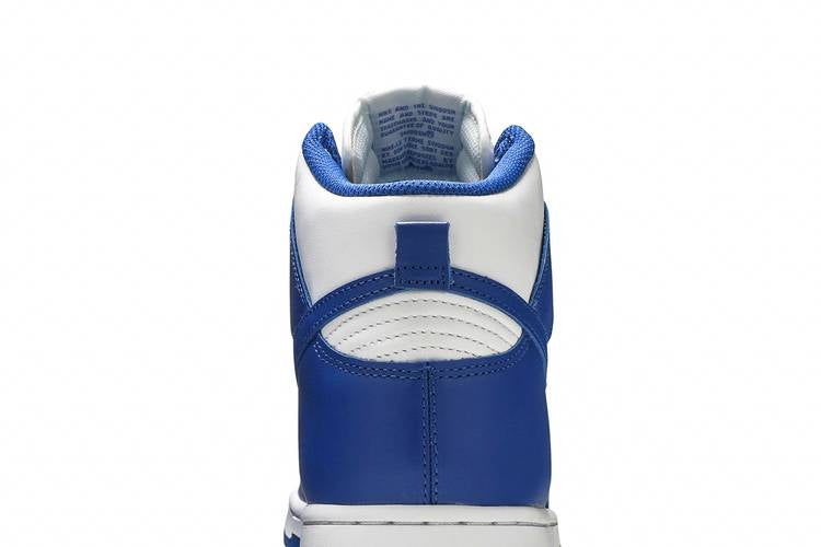 The Nike Dunk High Game Royal is a tribute to the classic 1985 University of Kentucky colorway. Crafted with a leather upper in white and Game Royal, this shoe offers breathability with perforations on the toe box and a nylon tongue. The two-tone design extends to the outsole with a concentric traction pattern for grip. Released in June 2021, this Dunk High is a stylish and nostalgic addition to any sneaker collection.