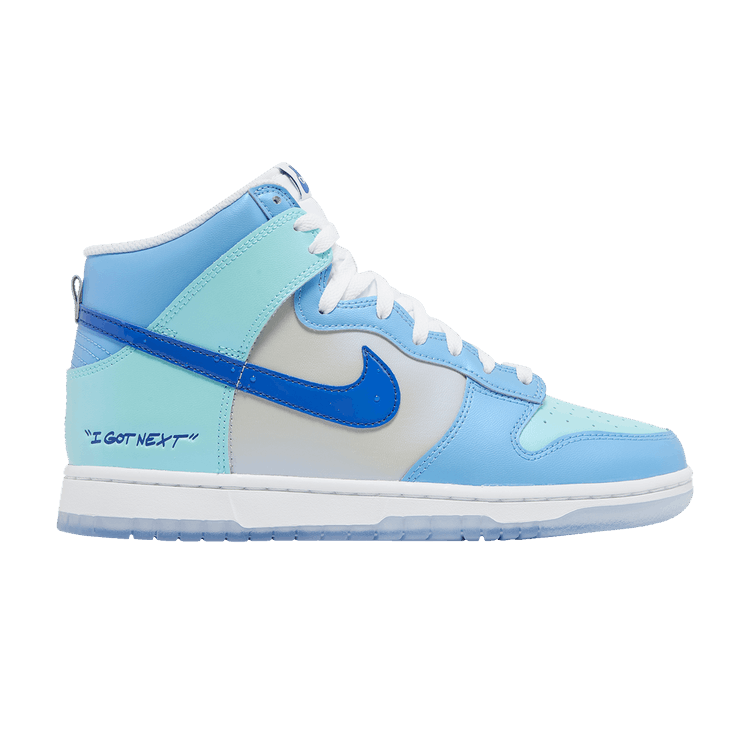 The Nike Dunk High I Got Next is the first edition of the brand’s "I Got Next" series, designed for young basketball players. It features a high-top silhouette with a blue-themed colorway inspired by the 2001 Argon. The upper combines a light-blue overlay with white laces and midsoles, paired with a blue outsole. Nike branding includes a dark-blue Swoosh on the outer side and a white Swoosh on the inner side. "I GOT NEXT" is printed on each heel’s lateral side. Released on July 2022, the Nike Dunk High I Got Next is available now at Side Kicks.