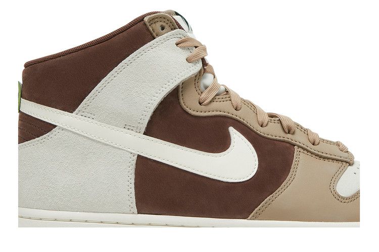 The Nike Dunk High Light Chocolate features a tonal brown and Sail color scheme with premium suede and leather construction. Green accents on the woven tongue label and heel tab provide subtle contrast. Its versatile design suits both casual and elevated styling. Released on February 2022, the Nike Dunk High Light Chocolate is available now at Side Kicks.