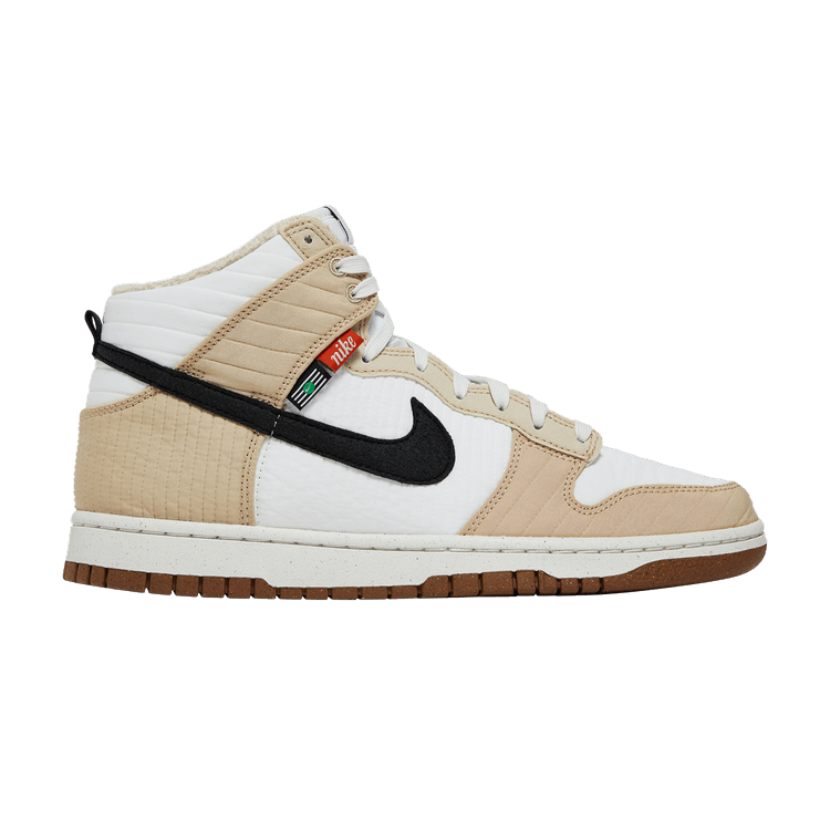 The Nike Dunk High Next Nature Toasty Rattan features an off-white sole and base with white laces and tongue. Beige leather accents appear on the sides, heel, and toe, while a black Nike Swoosh wraps around the back. The high-top design sits at ankle height. Released on November 2021, the Nike Dunk High Next Nature Toasty Rattan is available now at Side Kicks.