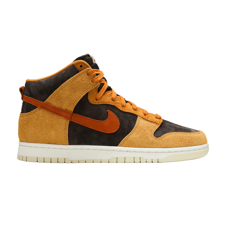 The Nike Dunk High PRM Dark Russet features a suede upper in Dark Russet with Velvet Brown hairy suede overlays. It includes a Dark Curry Swoosh and a white and brown woven tongue label. The design is finished with a Sail midsole and beige outsole. Released on March 2021, the Nike Dunk High PRM Dark Russet is available now at Side Kicks.