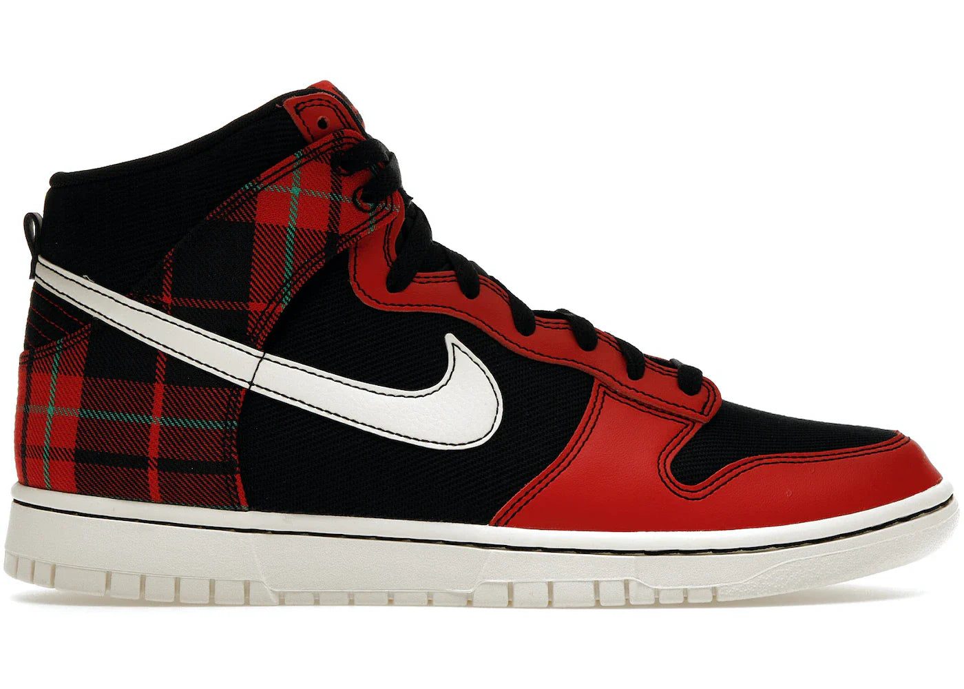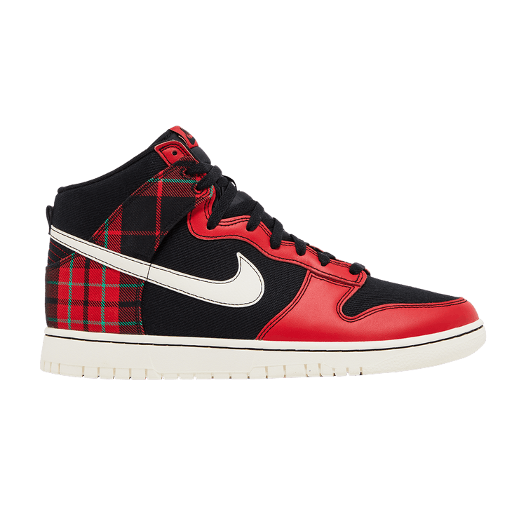 The Nike Dunk High SE Tartan Plaid Black University Red features a black twill base with University Red leather overlays on the toe cap and eyestays. White tumbled leather forms the Swoosh, while the ankle strap and heel showcase a red, black, and green tartan textile. The black ankle collar and red Nike logo patch on the tongue complete the design, set on a white midsole and rubber outsole. Released on January 18, 2023, the Nike Dunk High SE Tartan Plaid Black University Red is available now at Side Kicks.