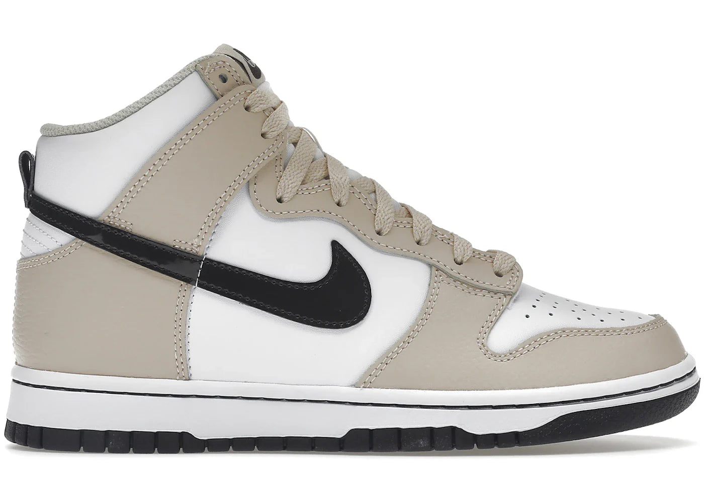 The Nike Dunk High White Sanddrift Brown (Women's) features a smooth white leather upper with perforated toe box for ventilation. Tan tumbled leather overlays contrast the base, while brown patent leather forms the Swoosh and heel pull tab. The grooved brown rubber outsole provides traction, and the white midsole features cupsole construction with contrasting brown stitching. Released on February 10, 2023, the Nike Dunk High White Sanddrift Brown (Women's) is available now at Side Kicks.
