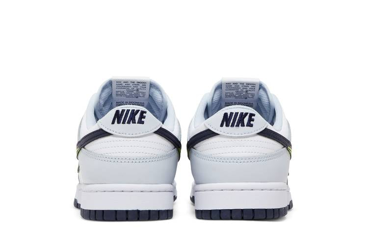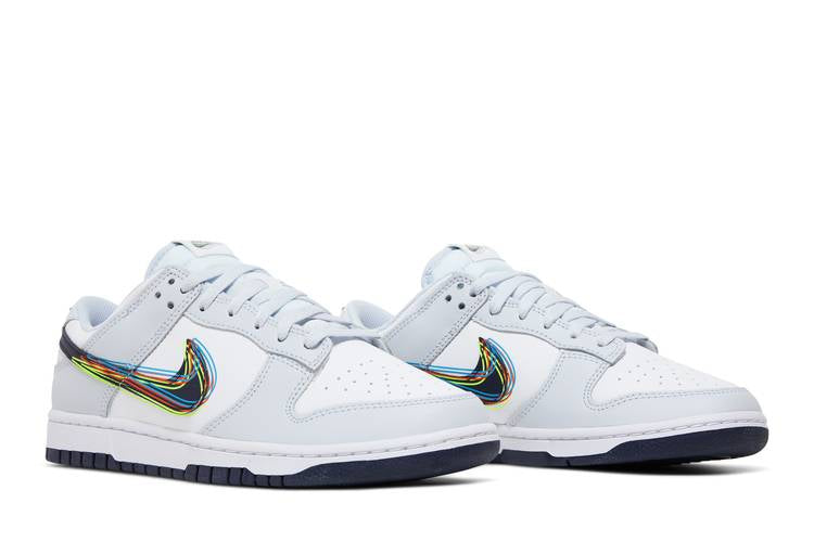 The Nike Dunk Low 3D Swoosh showcases a white leather upper with grey overlays and a black Swoosh adorned with layered primary-colored hollow Swooshes for a 3D effect. Additional features include woven tongue labels and a foam sole. Released in May 2022.