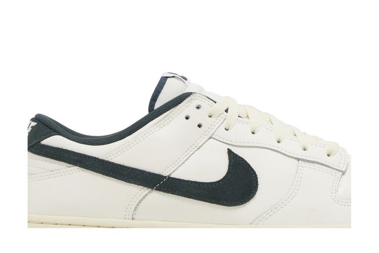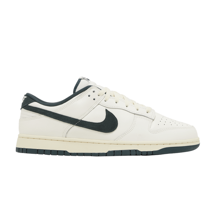 The Nike Dunk Low Athletic Department Deep Jungle features a Sail, Deep Jungle, Coconut Milk, and White colorway with a white base and dark green accents. The smooth leather upper contrasts with suede Swooshes, inner liner, heel tab, and rubber outsole. Minimal branding includes ‘NIKE’ stitching on the heel tab and a Nike label on the tongue. The off-white midsole adds a vintage look. Released on October 1, 2023, the Nike Dunk Low Athletic Department Deep Jungle is available now at Side Kicks.