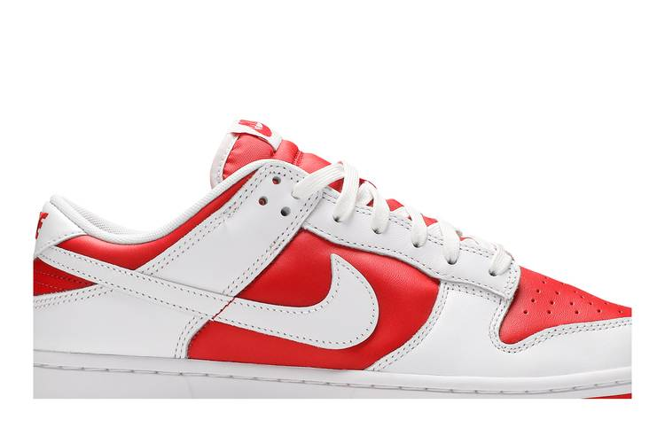 The Nike Dunk Low 'Championship Red' showcases a classic two-tone color scheme reminiscent of its original 'Be True to Your School' series back in 1985. Crafted with a University Red leather upper and complemented by white overlays including the Swoosh logo. This sneaker bears the iconic Nike branding on the insole, heel tab, and woven tongue tag, all resting on a durable rubber cupsole featuring white sidewalls and a vibrant red rubber outsole. A retro design that pays homage to the roots of the Dunk Low line.