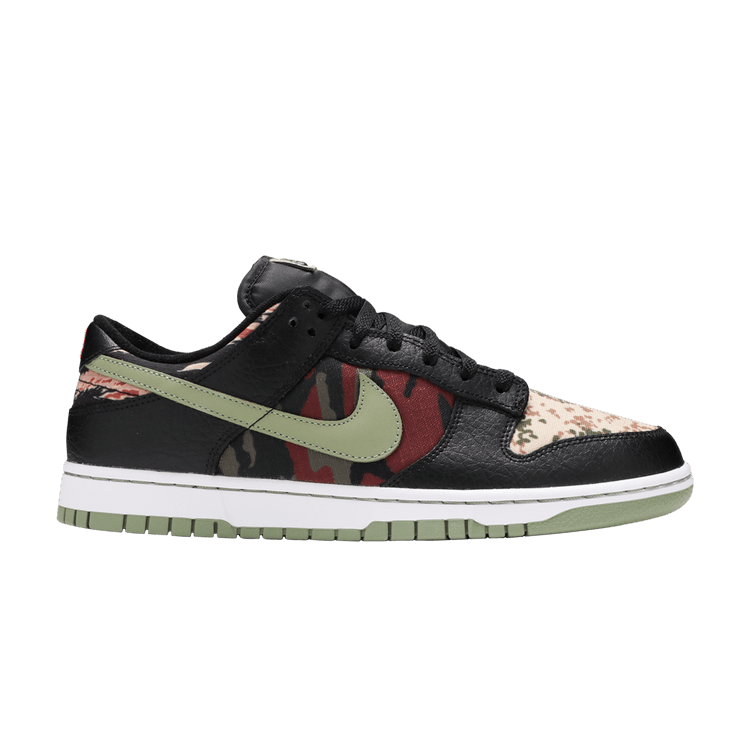 The Nike Dunk Low Crazy Camo features an asymmetric design with multi-color camo canvas, black leather overlays, and green Durabuck Swooshes. Nike embroidery on the heel tabs completes the look. Released on August 2021, the Nike Dunk Low Crazy Camo is available now at Side Kicks.