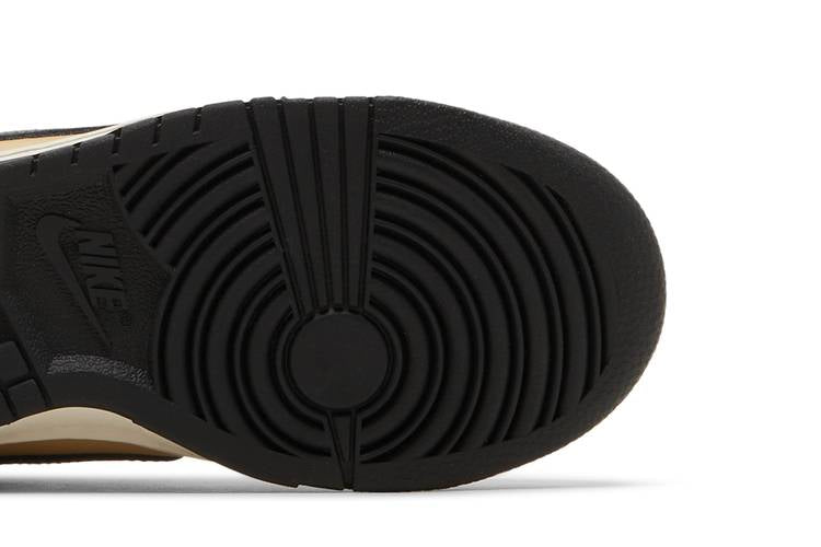 The Nike Dunk Low Dark Driftwood (Women's) features a smooth leather upper in beige with dark tan overlays and a black Swoosh. Nike branding is present on the tongue tag, sockliner, and heel tab. The shoe sits on traditional cupsole tooling with off-white sidewalls and a black rubber outsole designed for optimal grip. The color scheme includes dark driftwood, black, sesame, and sail hues, creating a versatile and stylish look.