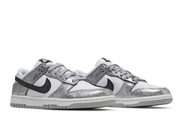 The Nike women's Dunk Low ‘Golden Gals’ boasts a shimmering design with silver-tone laces and metallic silver-flake leather overlays on a white textile base. Black accents on the Swoosh, tongue tag, and heel tab add contrast. The low-top shoe rests on a standard rubber cupsole with a white sidewall and grey outsole. Inspired by retro hoops, the design features a clean aesthetic with a focus on metallic details and contrasting colors.