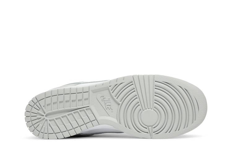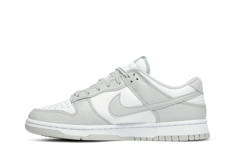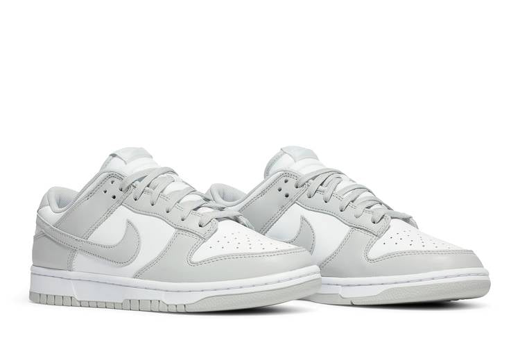 The Nike Dunk Low 'Grey Fog' showcases a two-tone colorway with a white leather upper and Grey Fog overlays. This classic silhouette, originally designed for college hoops in 1985, features a Swoosh, laces, and tongue tag in the same light grey hue. Additional Nike branding is found on the heel tab and padded sockliner. The shoe is set on a rubber cupsole with white sidewalls and a grey rubber outsole for a clean and timeless look.