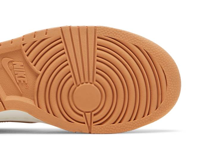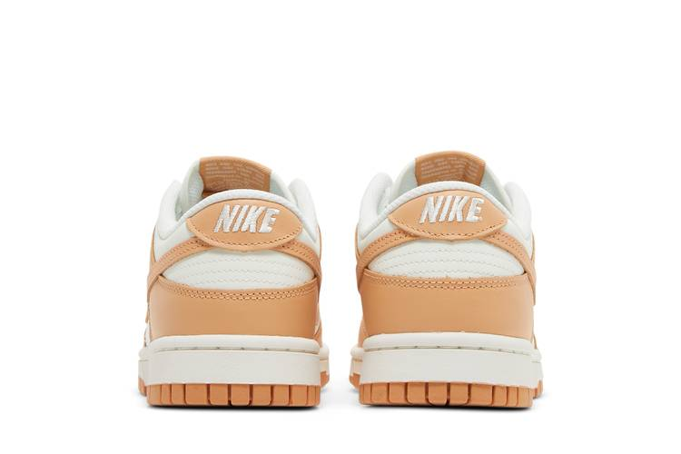 The Nike Dunk Low Harvest Moon (Women's) showcases a two-tone color scheme with a white leather base and peach beige overlays. This retro hoops shoe features a perforated toe box, nylon tongue, and embroidered Nike branding. The rubber cupsole provides stability with white sidewalls and a beige outsole. Designed for comfort and style, this sneaker is a must-have for any sneaker enthusiast.