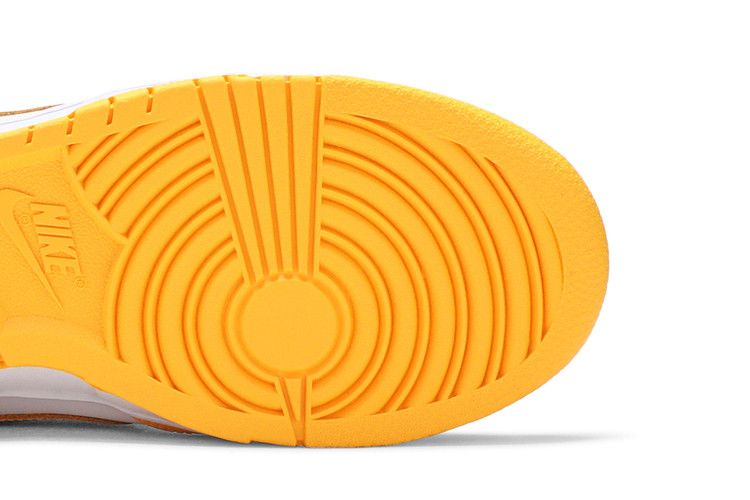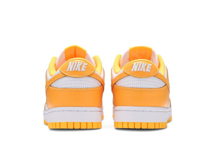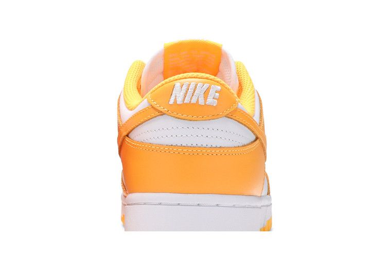 The Nike Dunk Low 'Laser Orange' for women features a white leather upper with vibrant orange overlays and a matching Swoosh. The low-cut collar is lined with soft textile for comfort, while Nike branding is found on the sockliner, heel tab, and tongue tag. The orange rubber outsole provides traction on various surfaces. Released in July 2021, this sneaker offers a vintage-inspired color blocking design for a classic look.