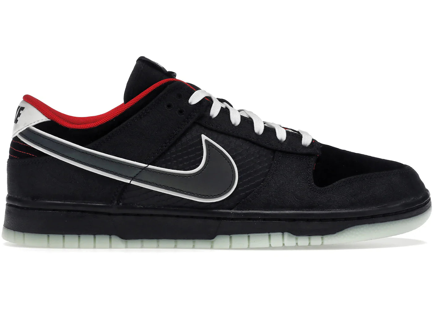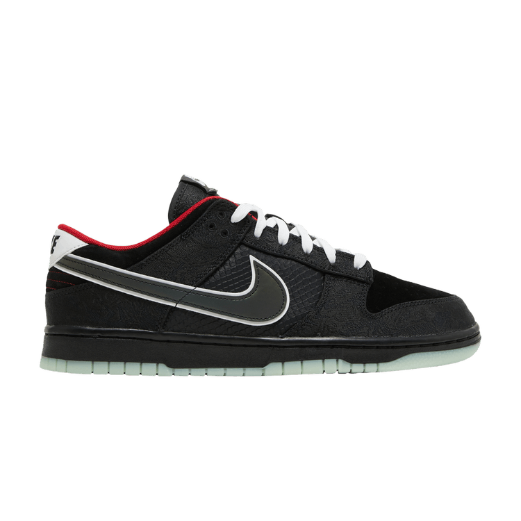 The Nike Dunk Low LPL League of Legends is a limited-edition collaboration with China's professional e-sports league. It features a black and white pixelated camouflage upper made of leather and synthetic materials, accented with crimson details. The midsole uses lightweight foam for comfort, while the rubber outsole provides traction. Black Nike Swooshes and branding appear on the sides, tongue, and heel. Released on December 4, 2021, the Nike Dunk Low LPL League of Legends is available now at Side Kicks.