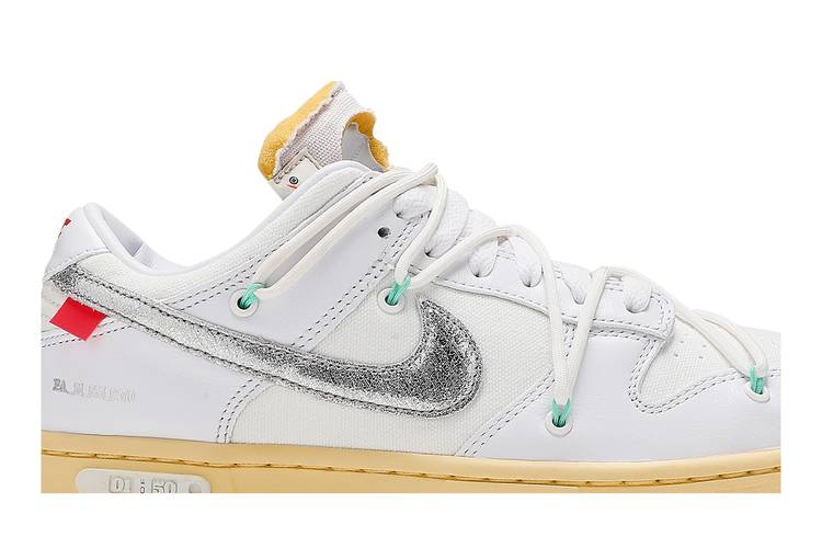 The Nike Dunk Low Off-White Lot 1 is a limited edition sneaker from the ‘Dear Summer’ collection, featuring a white canvas and leather upper with metallic silver Swoosh detailing. The design includes rope laces, Flywire cables, a pre-yellowed midsole, and signature Off-White elements like a plastic zip tie and Helvetica text. This shoe offers a unique vintage aesthetic and is a standout addition to any sneaker collection.