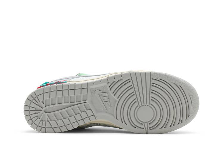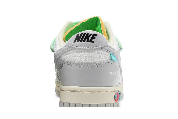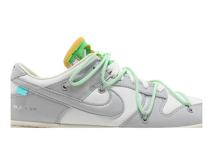 The Nike Dunk Low Off-White Lot 7 is part of the ‘Dear Summer’ collection by Virgil Abloh, featuring a white leather upper with grey canvas overlays and signature Off-White design elements such as a plastic zip tie and printed Helvetica text. Limited to fifty pairs, the sneaker includes pops of color on the secondary lacing system, zip-tie, tongue, and Swoosh tab. Made of leather, suede, and canvas, the design also incorporates a perforated toe box, rubber midsole, and treaded outsole for comfort and traction. Launching on August 9, 2021, this collaboration between Nike and Off-White offers a unique twist on the classic Nike Dunk Low silhouette.