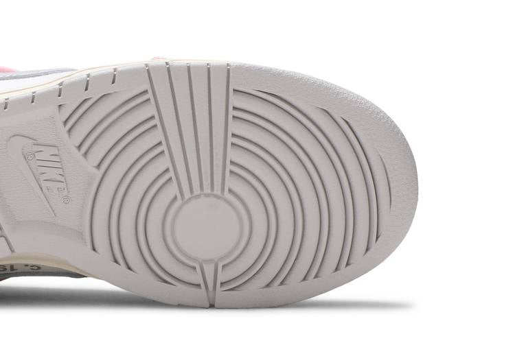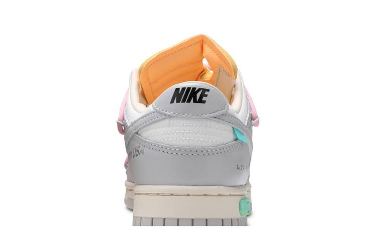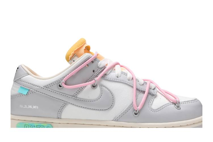 The Nike Dunk Low Off-White Lot 9 is a part of the 'Dear Summer' collection, designed by Virgil Abloh in collaboration with Nike Dunk. This limited edition sneaker features a white leather upper with grey canvas overlays, highlighted by unique design elements such as a plastic zip tie, printed Helvetica text, and a secondary lacing system. The shoe also includes an exposed-foam tongue, rectangular tab on the Swoosh, and a '9 of 50' badge on the lateral midsole. With only fifty pairs available, this exclusive release showcases Abloh's signature style and attention to detail.