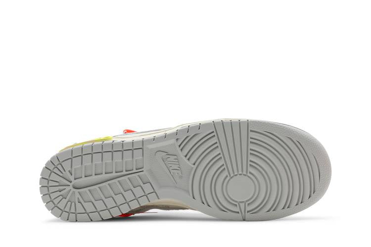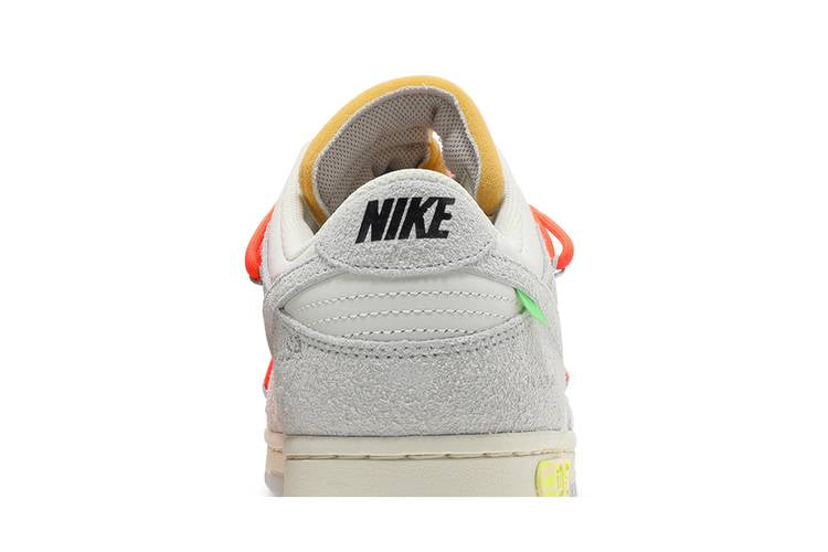 The Nike Dunk Low Off-White Lot 11 is part of the 'Dear Summer' collection, a continuation of Virgil Abloh's collaboration with Nike. This low-top sneaker boasts a white leather upper with grey suede overlays, complemented by signature Off-White details like the plastic zip tie and printed Helvetica text. Vibrant accents come from the secondary lacing system, zip tie, exposed-foam tongue, and Swoosh tab. Limited to just fifty pairs, each shoe is marked with a '11 of 50' badge on the lateral midsole.