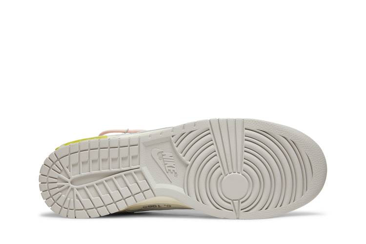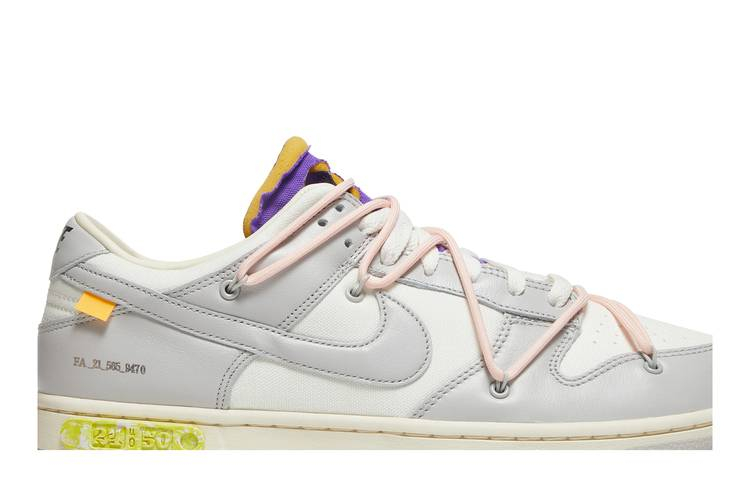 The Nike Dunk Low Off-White Lot 24 is a limited-edition sneaker released as part of the ‘Dear Summer’ collection. Featuring a white leather upper with grey canvas overlays, this low-top sneaker includes signature Off-White details such as a plastic zip tie, printed Helvetica text, and colorful accents on the laces, zip tie, tongue, and Swoosh tab. With only fifty pairs produced, each shoe is marked with a ‘24 of 50’ badge on the lateral midsole.