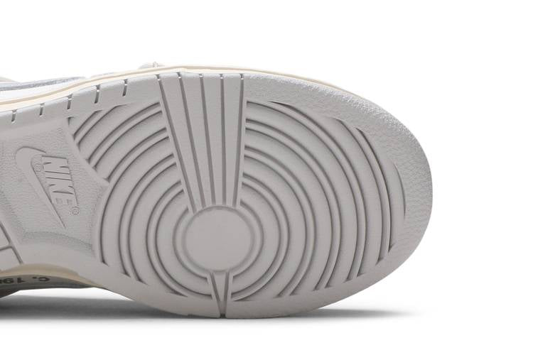 The Nike Dunk Low Off-White Lot 25 features a white leather upper with grey canvas overlays, highlighted by Virgil Abloh's signature design elements such as a plastic zip tie, printed Helvetica text, and contrasting pops of color on the secondary lacing system and exposed-foam tongue. Limited to fifty pairs, each shoe is individually numbered with a '25 of 50' badge on the lateral midsole. This sneaker is part of the exclusive 'Dear Summer' collection, showcasing a unique and stylish design inspired by Off-White's distinctive aesthetic.
