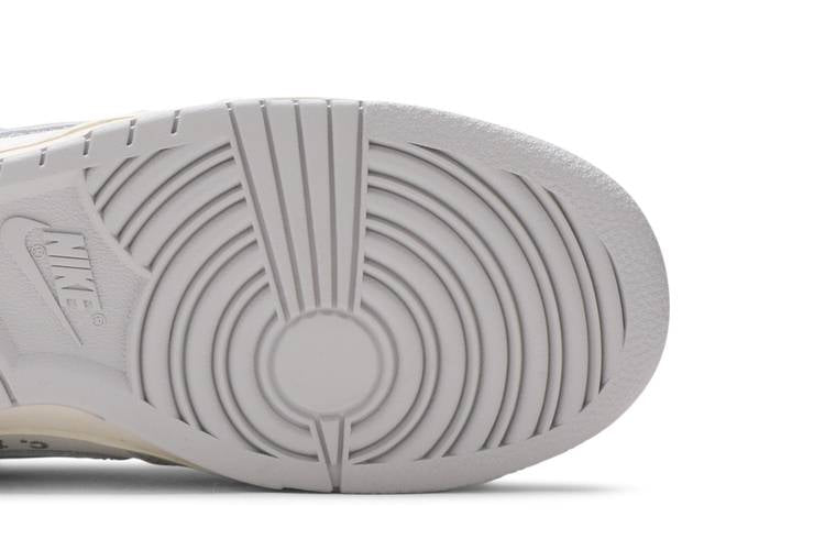 The Nike Dunk Low Off-White Lot 2 is part of the ‘Dear Summer’ collection, featuring a white leather upper with grey canvas overlays and signature Off-White details like a zip tie and printed text. Limited to fifty pairs, each shoe is marked with a ‘2 of 50’ badge. The shoe combines leather, suede, and mesh for durability and breathability, with a padded tongue for comfort. The herringbone-patterned outsole provides grip, while the Nike Air cushioning in the midsole offers shock absorption. The color scheme of sail and neutral grey-blue fury adds a vibrant touch to the classic silhouette.
