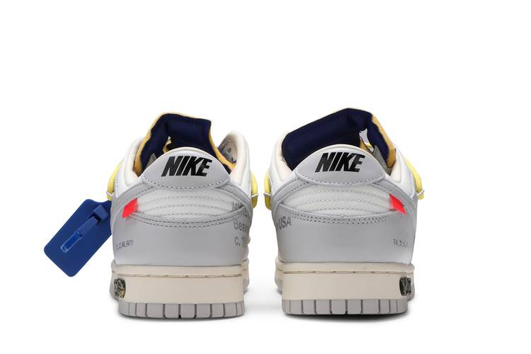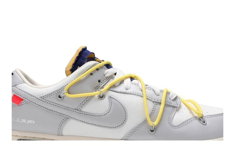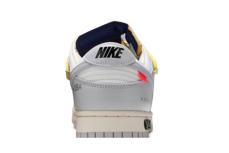 The Nike Dunk Low Off-White Lot 27 is a limited-edition collaboration between Nike and Off-White. Featuring a white leather upper with grey canvas overlays, this low-top sneaker includes signature Off-White details like a plastic zip tie, printed Helvetica text, and pops of color on the secondary lacing system, zip tie, tongue, and Swoosh tab. Limited to fifty pairs, each shoe is marked with a ’27 of 50’ badge on the lateral midsole. The outsole is constructed of rubber with a lug and circular tread pattern, while Nike branding is visible on the heel and sole. The deconstructed tongue and round toe cap add to the unique design of this exclusive release.