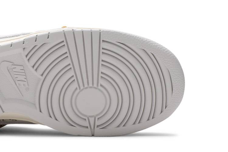 The Nike Dunk Low Off-White Lot 37 is a limited edition sneaker from the 'Dear Summer' collection by Off-White. Featuring a white leather upper with grey suede overlays, this low-top silhouette includes signature Off-White design elements such as a plastic zip tie, printed Helvetica text, and contrasting pops of color. Limited to fifty pairs, each shoe is marked with a '37 of 50' badge on the lateral midsole. Crafted with premium materials like leather and suede, this sneaker combines luxury with street style.