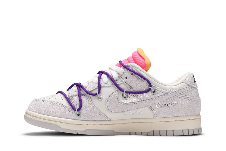 The Nike Dunk Low Off-White Lot 15 is a limited edition sneaker from the 'Dear Summer' collection by Virgil Abloh. Featuring a white leather upper with grey suede overlays, this low-top design includes signature Off-White details like a plastic zip tie, printed Helvetica text, and vibrant pops of color on the secondary lacing system. With only fifty pairs produced, each shoe is marked with a '15 of 50' badge on the lateral midsole. This exclusive collaboration combines style and uniqueness for sneaker enthusiasts.
