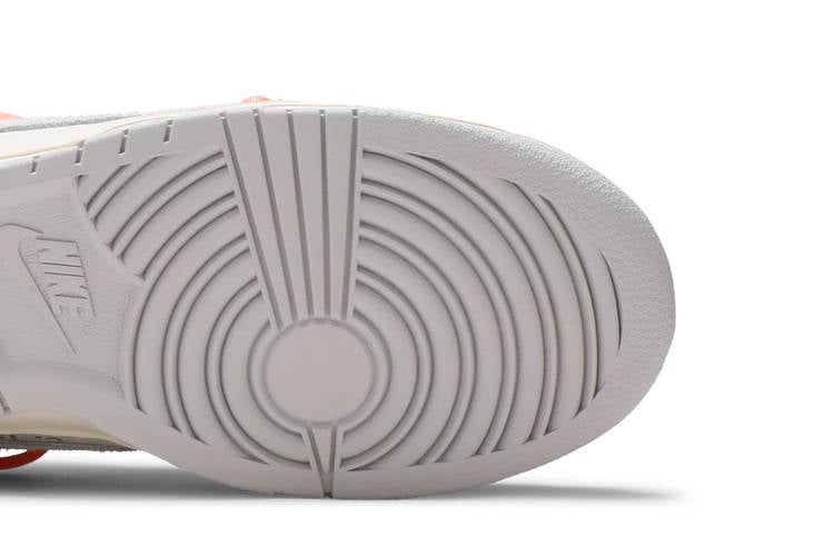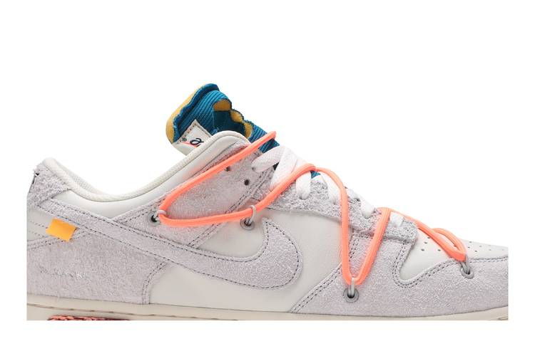 The Nike Dunk Low Off-White Lot 19 is a collaborative sneaker by Off White and Nike released as part of the ‘Dear Summer’ collection. This low-top sneaker features a white leather base with Light Grey suede overlays. Contrasting tones appear on various parts of the upper, including the Orange Pulse bungee-style secondary lacing system, the rectangular tab attached to the Swoosh, the zip tie, and an exposed foam tongue. Other details include Nike branding on the heel, Virgil Abloh's Helvetica text on the medial in Glossy Silver accents, white laces, and unique tongue branding. Rounding out this sneaker’s design is an Off White midsole with a ‘19 of 50’ badge on the lateral heel and a light grey rubber outsole. Limited to fifty pairs, this sneaker is a standout piece in any collection.
