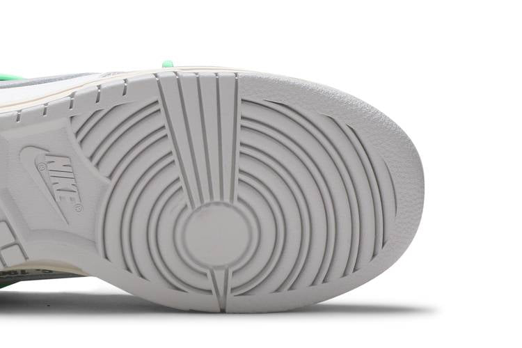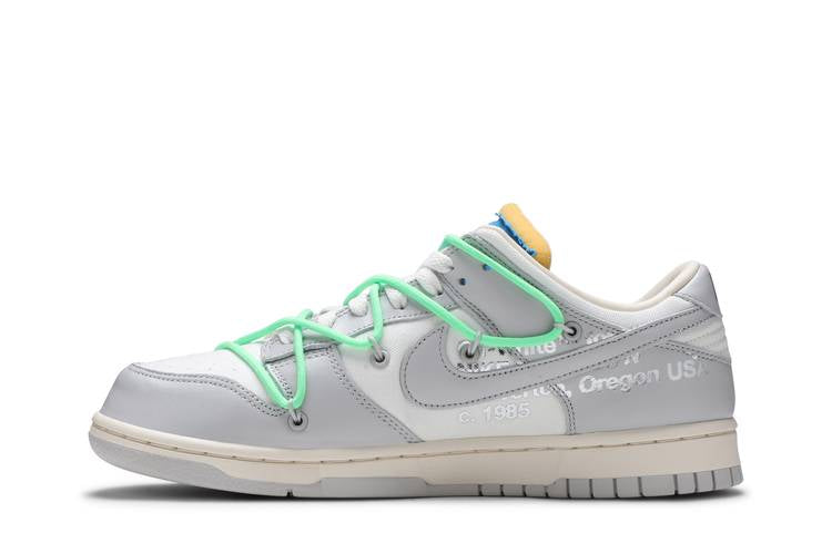 The Nike Dunk Low Off-White Lot 26 is part of the 'Dear Summer' collection, a collaboration between Off-White and Nike. It features a white leather upper with grey canvas overlays, signature Off-White details like a zip tie and printed text, and pops of color on the lacing system and Swoosh. Limited to fifty pairs, each shoe is numbered with a '26 of 50' badge. Released in August 2021, this sneaker is a rare and highly sought-after collector's item.