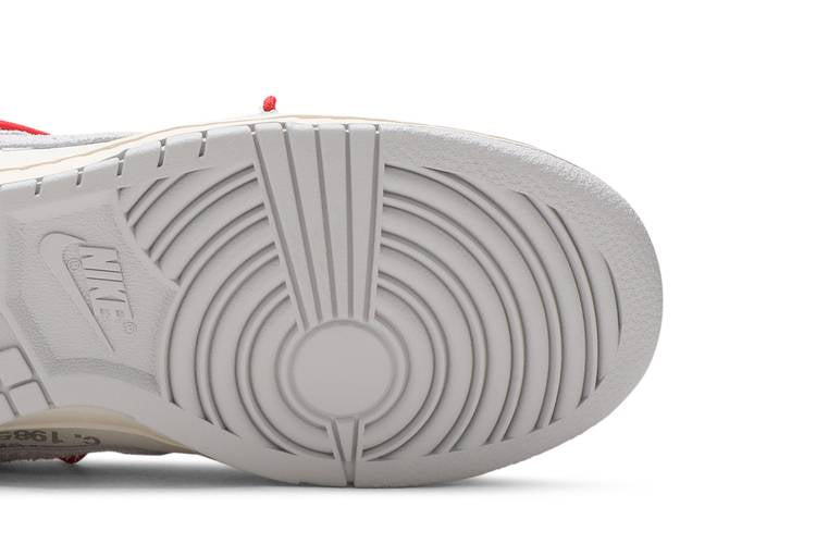The Nike Dunk Low Off-White Lot 33 is part of the ‘Dear Summer’ collection, a collaboration between Nike and Virgil Abloh. The sneaker features a white leather upper, grey suede overlays, and signature Off-White details like a plastic zip tie and printed Helvetica text. Contrasting pops of color are seen in the secondary lacing system, zip tie, exposed-foam tongue, and Swoosh tab. Limited to fifty pairs, each shoe is marked with a ’33 of 50’ badge on the lateral midsole.